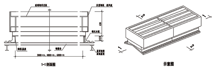 3、通风设备的所有通风面大于相应屋脊面很多,而且通风设备可根据具体要求选择开敞式或启闭式。