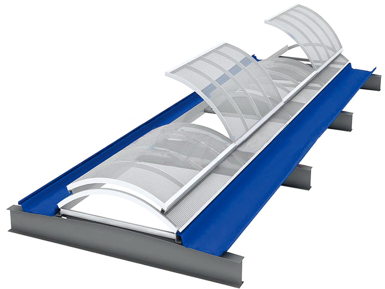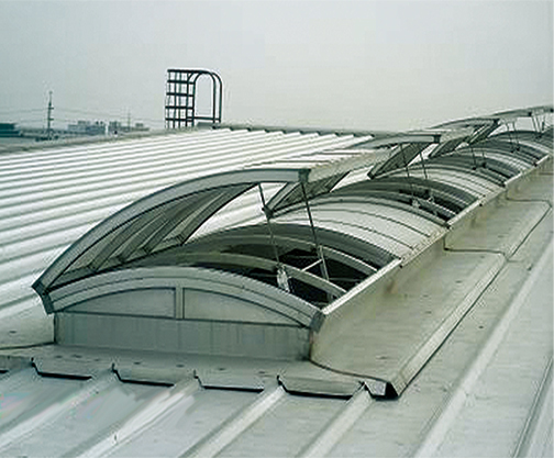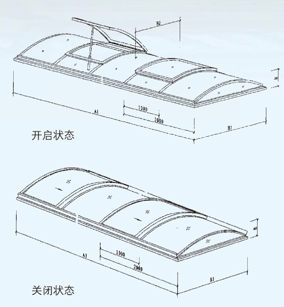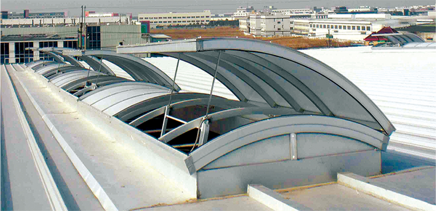 上开式圆拱型电动采光窗适用于平时以采光为主,必要时开启的建筑,上开式天窗整体骨架结构有矩形钢管和铝合金型材结合构成,天窗开启机构设置在天窗中间,一套天窗开启机构可开启长度1200MM的天窗,天窗开启扇向上开启,开启角度一般为30°~45°。