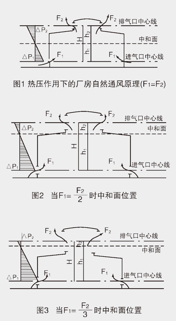 图1所示为热压作用下的厂房自然通风原理图:图中F1为进口面积、F2为排气口面积、△P1为进气压力、△P2为排气压力,中和面以上为排气区、中和面一下为进气区。