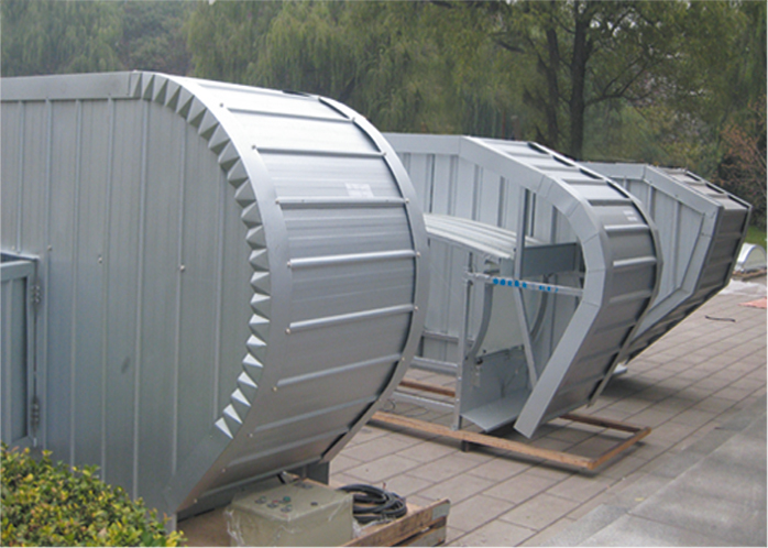 1.TC开敞式弧线型屋顶通风天窗是由外围护板、框架、挡雨板(导流板)、流水槽、落水管、泛水板等组成。