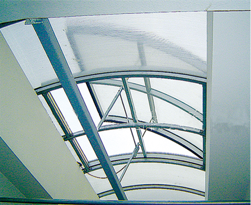 上开式圆拱型电动采光窗适用于平时以采光为主,必要时开启的建筑,上开式天窗整体骨架结构有矩形钢管和铝合金型材结合构成,天窗开启机构设置在天窗中间,一套天窗开启机构可开启长度1200MM的天窗,天窗开启扇向上开启,开启角度一般为30°~45°。